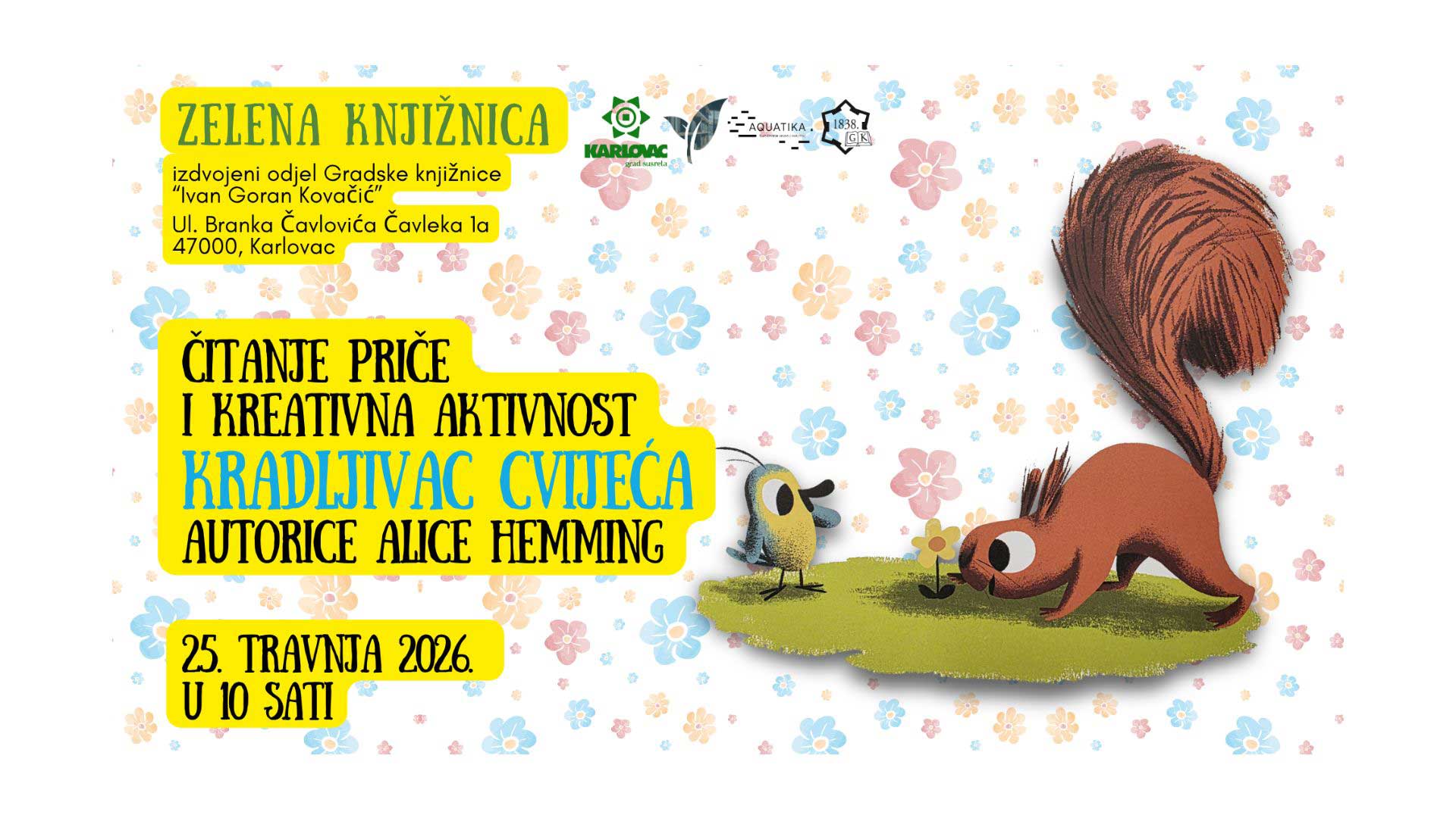 Pozivamo vas u subotu, 25. travnja 2026. u 10 sati u Zelenu knjižnicu gdje ćemo u okviru manifestacije „Proljeće u Karlovcu“ čitati slikovnicu „Kradljivac cvijeća“ autorice Alice Hemming.